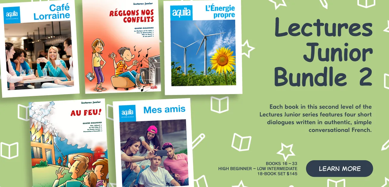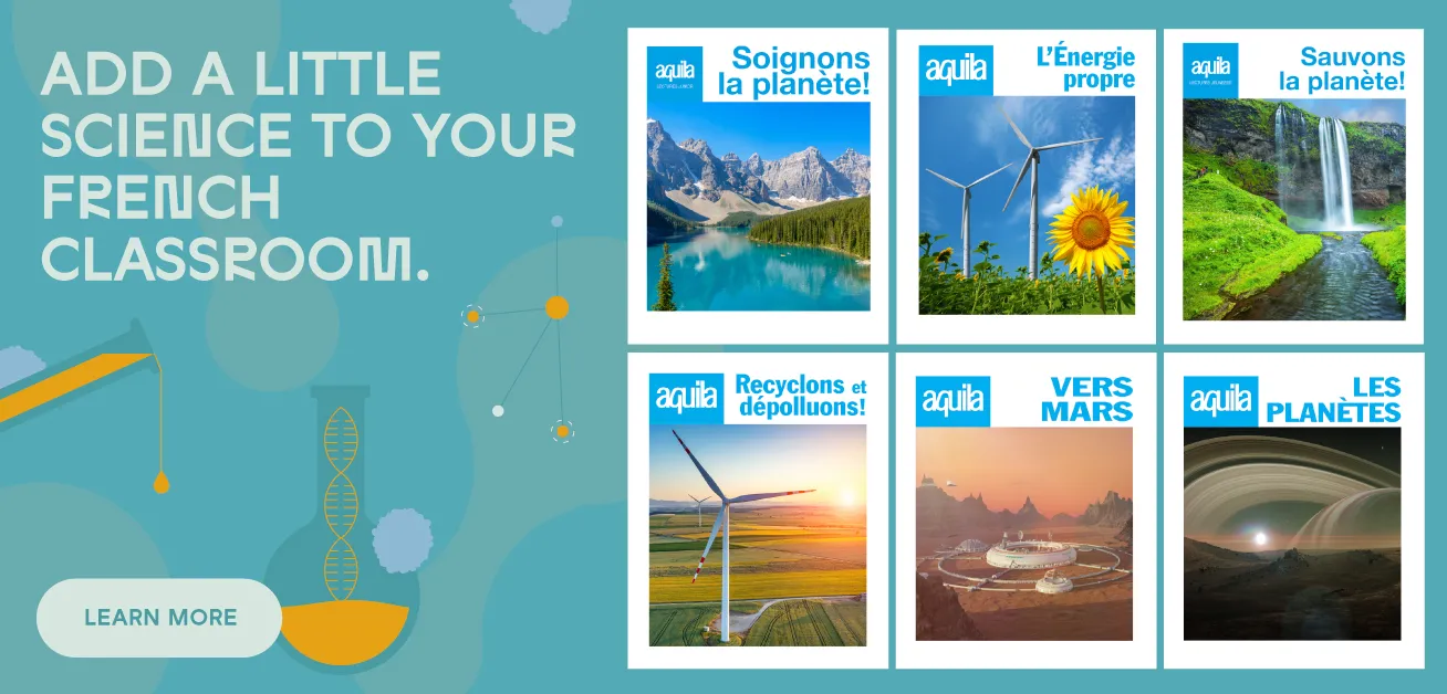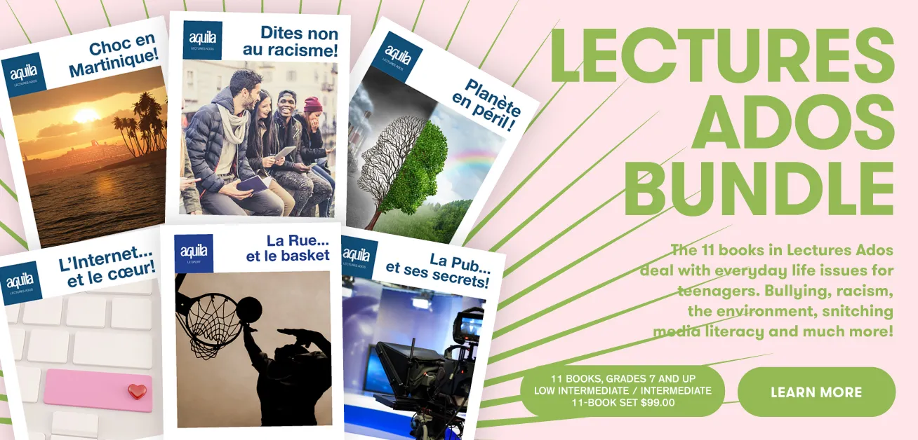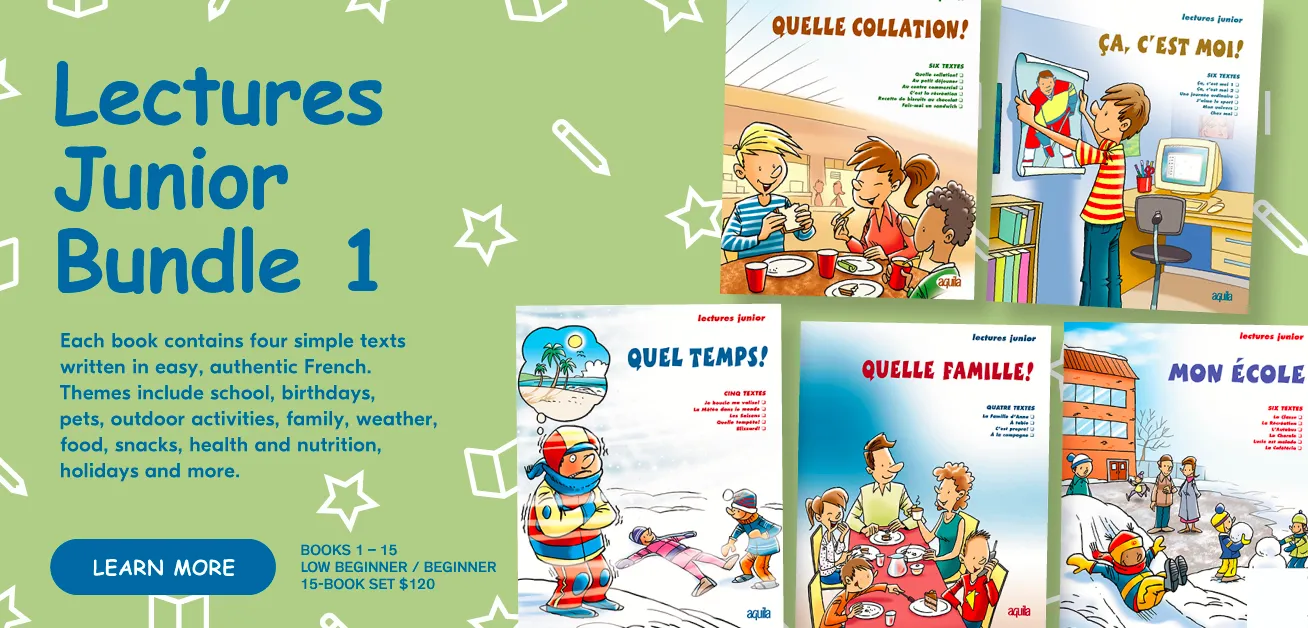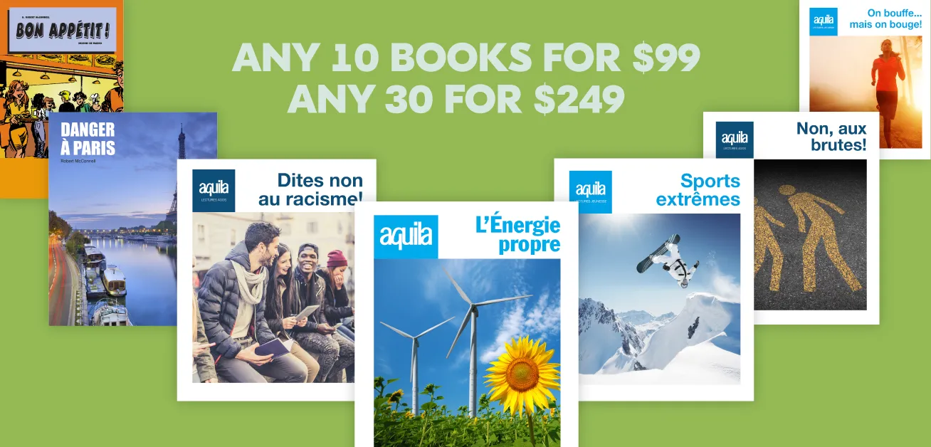 As a grade five extended French teacher, I have found that Aquila products are easy to access for students beginning in their study of their second language. The themes are engaging and easy for students to relate to, and the visuals and graphics help to scaffold the reading strategies that students need to build in order to become confident, independent readers.