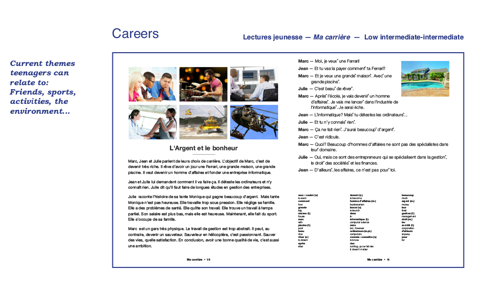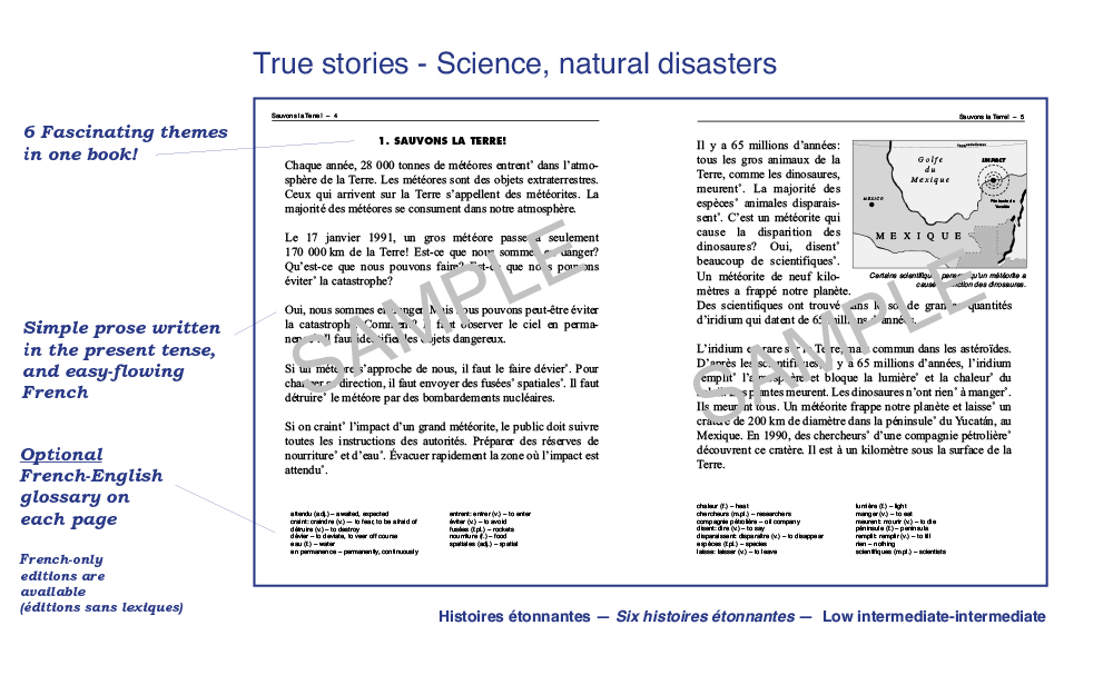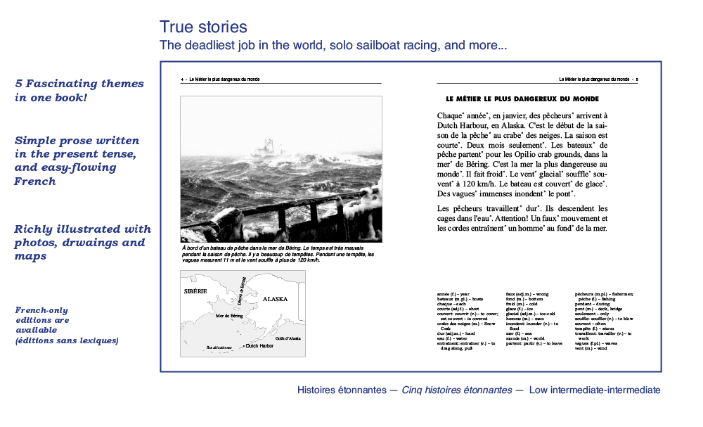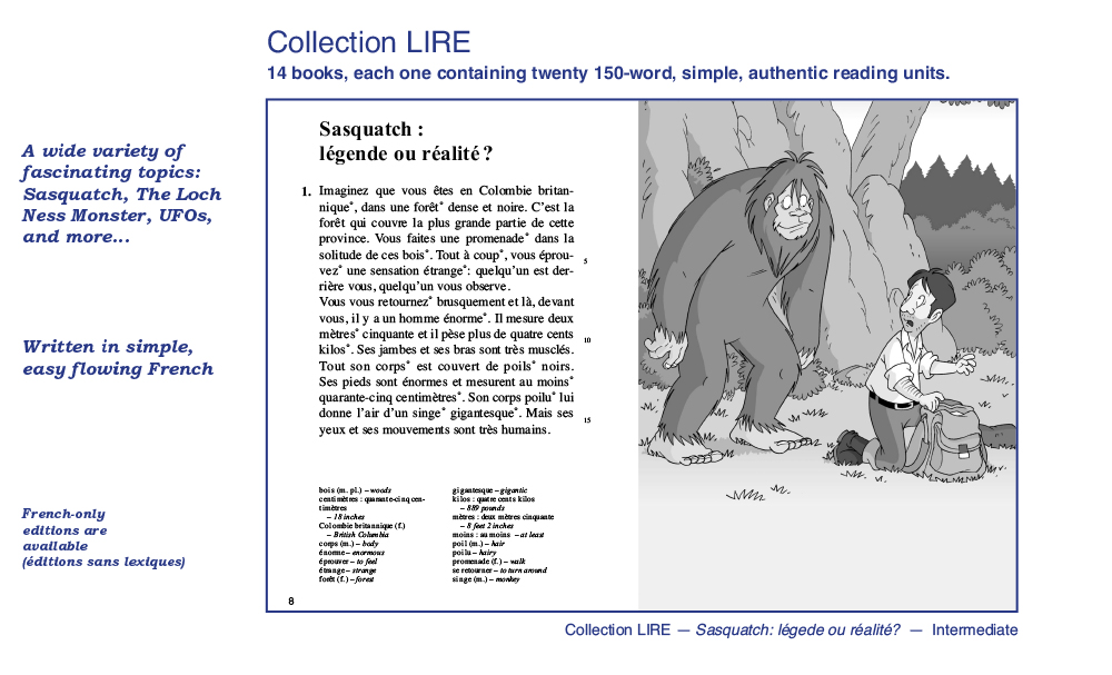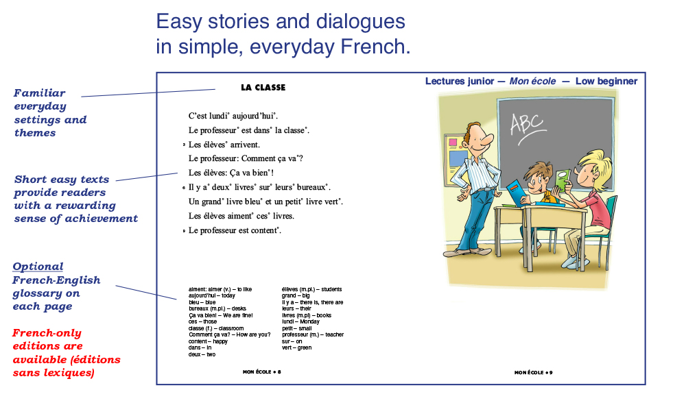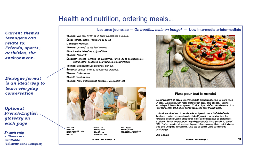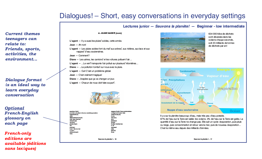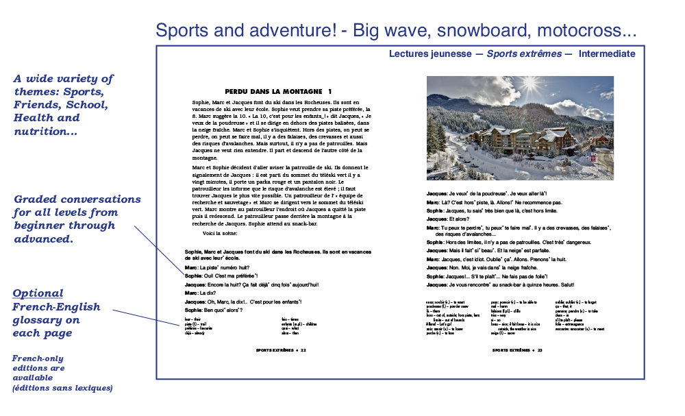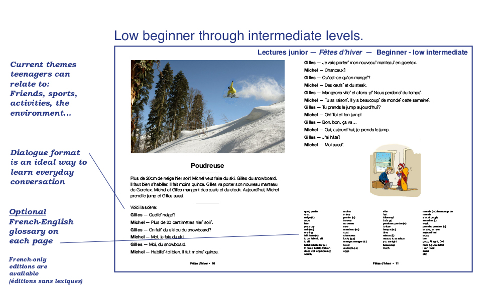 We have been publishing easy French readers and audiobooks for the second language learner since 1970. Our books reflect a variety of themes and styles, and are written in simple, easy-flowing French, using everyday vocabulary and expressions. Aquila readers are not translations or adaptations: They are original, authentic, age and level-appropriate texts especially written for the young reader of French as a second language. Most of our books are written in dialogue format and will amuse readers with short, humorous stories in everyday situations: School, family, sports, ordering meals, friends, winter holidays, shopping, the environment, anti-bullying, racism, media literacy and many more familiar, everyday themes children, young adults and teenagers can relate to. Books contain an exhaustive French-English vocabulary (optional) and a multitude of activities for comprehension, vocabulary and easy grammar. Our audiobooks – and new audio-visual e-books which feature highlighted read-along text – have been recorded by professional actors playing the roles of the characters in the stories. These audiobooks are A great way to reinforce both reading and listening comprehension. We have hundreds of readers and audiobooks for many reading levels. We invite you to explore our website to read and listen to audio excerpts. Call us direct at 1-800-667-7071 and we will be glad to guide you through our many reading programs. Below is a quick glimpse of the different styles, formats and levels available in our catalogue. Bonne lecture!